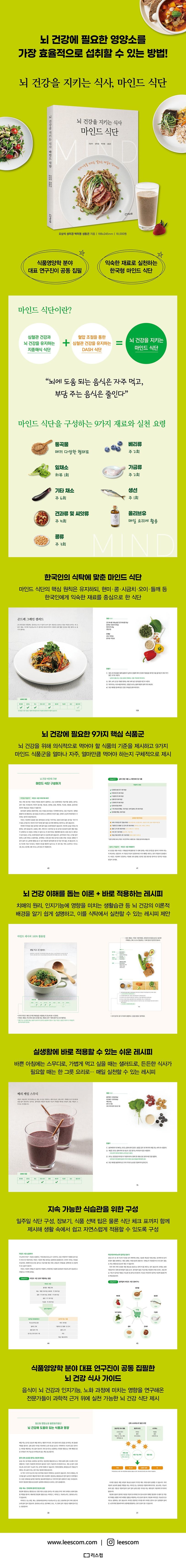 이같은내용을바탕으로한〈뇌건강을지키는식사,마인드식단〉은치매를두려워하는사람만을위한책이아닙니다.앞으로의시간을건강하게보내고싶은사람,부모의식사를걱정하는가족,지금부터라도식습관을점검하고싶은중장년모두를위한식생활가이드입니다.