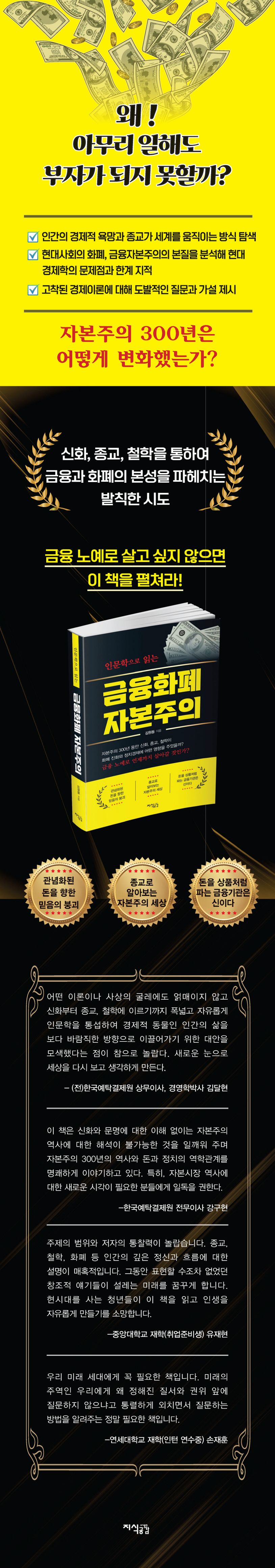 경제생활을 이해하는 데는 경제학만으로 충분하지 않다. 정치, 경제, 사회, 종교, 역사에 대한 깊은 이해 없이는 현대 경제학의 문제점을 파악하거나 대안을 제시하기 어렵다. 고전 자유주의 경제학인 ‘스미즘’, 사회주의 경제학으로 알려진 ‘막시즘’, 자본주의 경제학인 ‘케인즘’, 신자유주의 경제학인 ‘레이거주의’, ‘대처주의’ 등은 이미 많은 참고 서적을 통해 알려져 있다. 이 책에서는 최근 주목받는 우파 경제학인 ‘자본론’과 금융자본주의의 이념적 근거를 탐구하며, 향후 수정 대안을 제시하고 있다. 이를 위해 파격적이고 도전적인 사례와 가설들을 제시하며 토론의 주제나 논거를 제안한다.