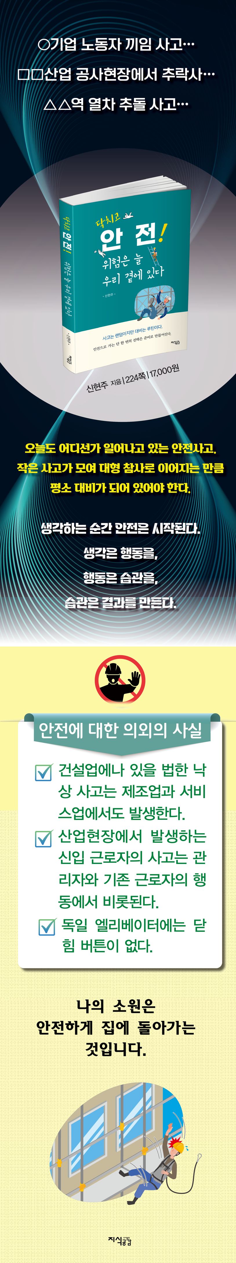 프롤로그1부.그날,멈췄다면-위험은생각보다가까이있다삶과죽음을결정한30초생각하는순간,안전이시작된다시민의식은선진국,안전의식은후진국?35초의기적에펠탑효과와안전고전속에담긴안전의통찰2부.안전하지않은사회-우리는왜늘준비되지않았는가위급상황에작동하지않는재난안전통신망?비극으로얼룩진축제,다중밀집사고속도에중독된사회가놓친것에스컬레이터,이제멈춰야할발걸음나의생명을위협하는스마트폰학교안전교육,이대로괜찮은가?3부.인간의마음안에숨어있는위험-심리를알면안전이보인다집단속에서는왜판단이흐려질까안전은인간본성과의끊임없는싸움이다누군가가보고있을때우리는더조심한다안전성이위험을높인다리스크를감수하는인간,그심리의이면4부.이제는행동할시간-바꿀수있다면지금부터아는만큼보인다,안전도마찬가지다사고에감성은통하지않는다화재경보기가울리는데왜가만히있나요산업현장에는아직도매일100명의장애인이발생영국은어떻게‘안전한나라’가되었을까기업살인법,책임을묻는법의힘에필로그참고문헌