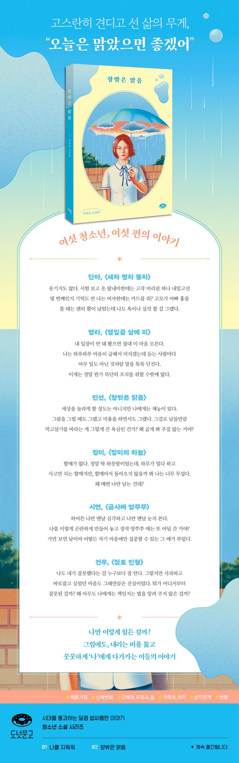 《창밖은 맑음》은 여섯 편의 짧은 이야기를 엮은 소설집이다. 서로 다른 상황에 놓인 청소년들의 이야기를 담은 이 책은 단편소설집이기에 구현할 수 있는 폭 넓은 주제의식을 보여 준다. 가족과의 관계, 신체적인 변화, 친구 사이의 오해, 꿈과 현실의 괴리 등, 각 작품의 주제는 모두 오늘을 살아가는 청소년이라면 누구에게나 찾아올 수 있는 중요한 고민거리들이다.