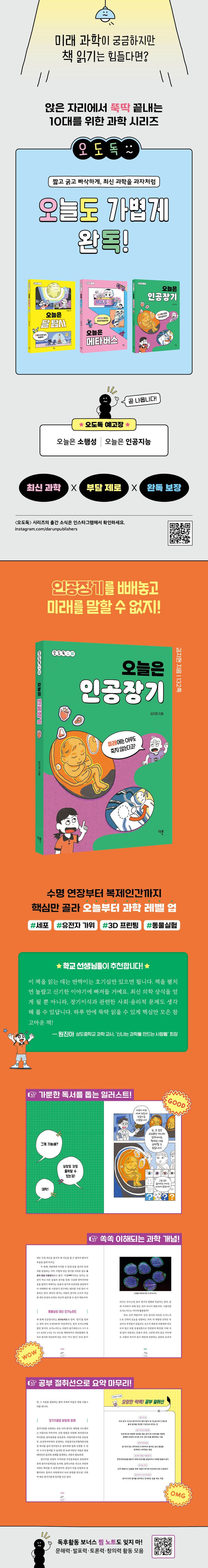 세계적인 미래학자 레이 커즈와일은 “2045년이 되면 아무도 죽지 않는 시대가 온다”라고 예측했습니다. 정말 그런 미래가 올까요? 황당하게 들릴 수도 있겠지만 허무맹랑한 이야기라고 단정 지을 수만은 없습니다. 실제 의학이 발달하는 속도에 따라 예상한 것이거든요. 다치거나 병든 몸을 대체하는 인공장기는 21세기에 가장 활발하게 연구되고 있는 의학 분야입니다. 동물의 장기를 인간에게 옮기는가 하면 실험실에서 심장을 출력하고, 도롱뇽처럼 몸을 되살리는 줄기세포를 개발하는 등 놀라운 기술이 하나하나 현실이 되고 있습니다. 이 책은 인공장기를 만드는 과학을 청소년의 눈높이에서 친절하고 재치 있게 펼쳐 보입니다. 세포와 장기, 혈관 등 우리 몸을 이루는 기본 개념부터 3D프린팅과 유전자가위를 비롯한 최첨단 과학까지 앉은 자리에서 쓱싹 이해할 수 있게 구성했습니다.