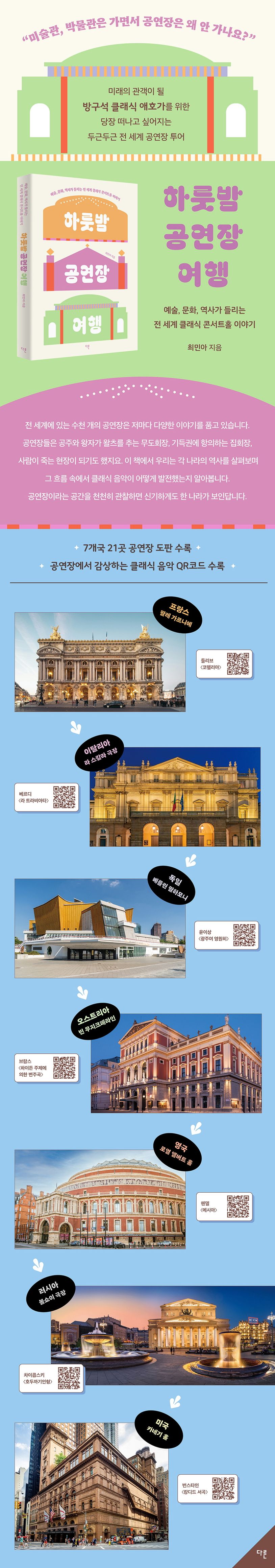 《하룻밤 공연장 여행》은 바로 그 즐거움으로 이끄는 전 세계 클래식 콘서트홀 안내서다. 프랑스, 이탈리아, 독일, 오스트리아, 영국, 러시아, 미국에 이르기까지 7개국의 유명 공연장 21곳을 소개한다. 팔레 가르니에, 베를린 필하모니, 로열 앨버트 홀, 볼쇼이 극장, 카네기 홀 등 이름만 들어도 설레는 공연장들을 다채로운 도판과 함께 들여다본다. 건물의 건축양식과 구조설계, 인테리어와 내부의 예술품 등으로 여행 욕구를 자극하는 건 물론이다. 공연장에 얽힌 흥미로운 뒷이야기, 공연장을 대표할 만한 인물과 음악까지 알차게 소개해 도슨트의 설명을 따라 걷는 듯하다. 이 책은 방구석 클래식 애호가에게 공연장을 ‘영업’하기 위해 쓰였다. 여행을 떠나는 마음으로 순서에 상관없이 마음에 드는 공연장을 골라 읽어도 좋다.