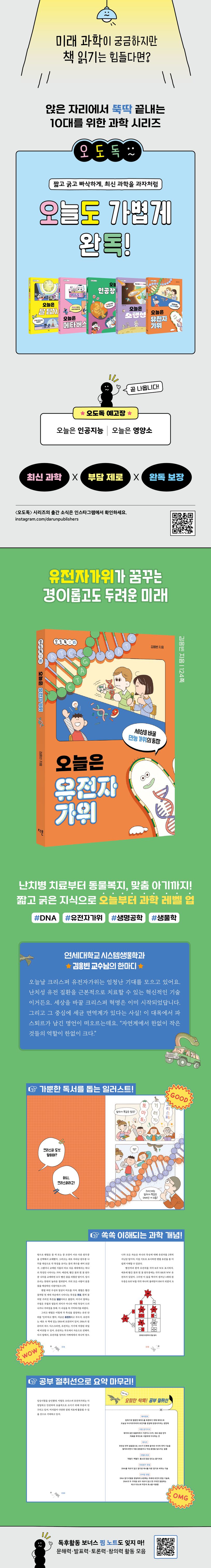 우리 일상에 다가와 있는 기술이지만, 여전히 유전자가위가 정확히 무엇인지 잘 모르는 사람이 많습니다. 《오늘은 유전자가위》는 유전자가위의 모든 것을 청소년의 눈높이에 맞춰 친절하고 유쾌하게 펼쳐 보입니다. DNA와 유전자, 염기 등 생물학의 기본 개념부터 유전자가위 기술의 발전 역사와 미래 전망, 현재 이루어지는 연구와 기술이 활용된 사례, 그리고 다양한 쟁점까지 앉은 자리에서 완독할 수 있는 분량으로 빠짐없이 담았습니다.