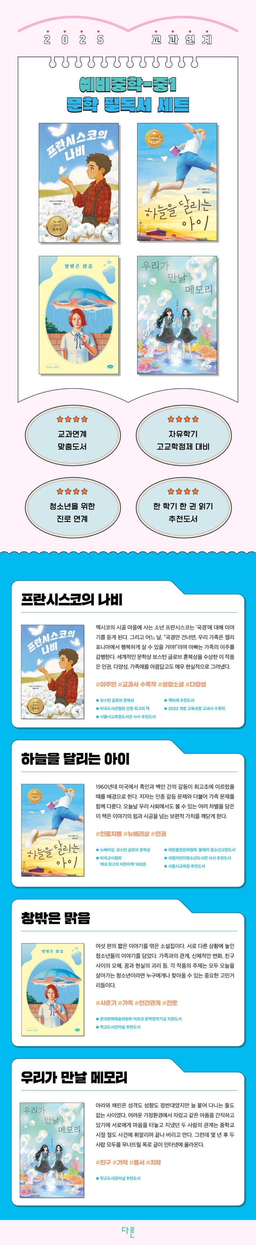 예비중학-중1 문학 필독서 세트는 〈프란시스코의 나비 (양장 특별판)〉, 〈하늘을 달리는 아이〉, 〈창밖은 맑음〉, 〈우리가 만날 메모리〉 총 4권으로 구성되어 있다.