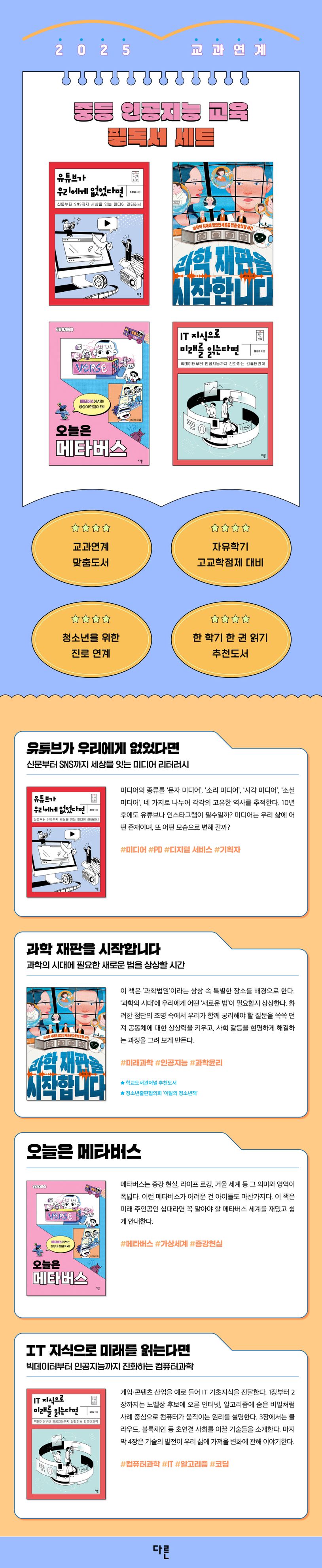 중등 인공지능 교육 필독서 세트는 〈유튜브가 우리에게 없었다면〉, 〈과학 재판을 시작합니다〉, 〈오늘은 메타버스〉, 〈IT 지식으로 미래를 읽는다면〉 총 4권으로 구성되어 있다.