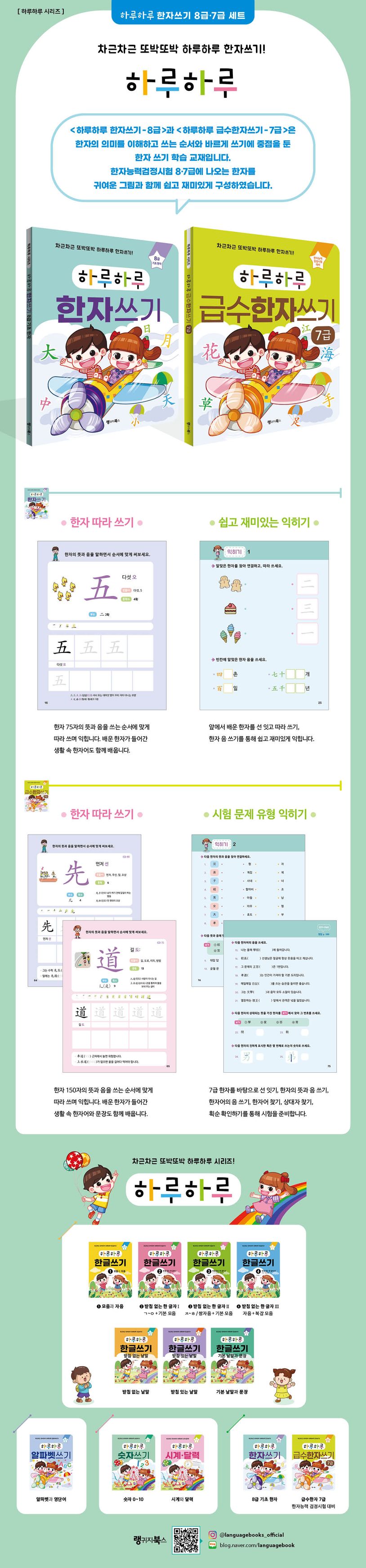 〈하루하루 한자쓰기 - 8급〉과 〈하루하루 급수한자쓰기 - 7급〉은 한자의 의미를 이해하고 쓰는 순서와 바르게 쓰기에 중점을 둔 한자 쓰기 학습 교재입니다. 한자능력검정시험 8급ㆍ7급에 나오는 한자를 귀여운 그림과 함께 쉽고 재미있게 구성하였습니다.