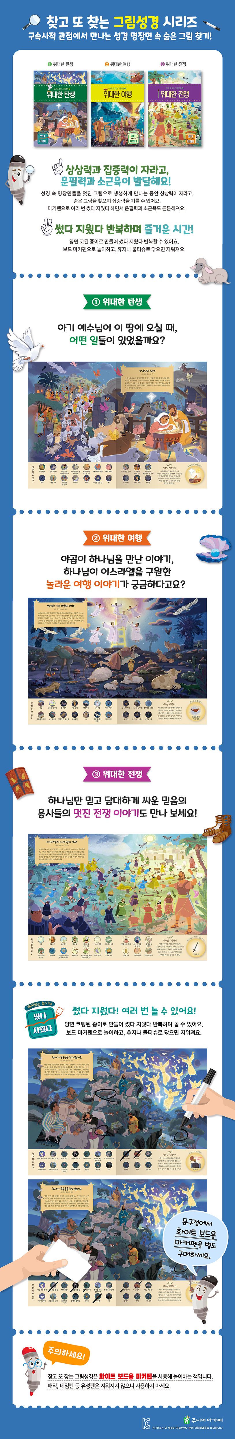 찾고 또 찾는 그림성경 시리즈는 화이트 보드용 마커펜을 사용해 놀이하는 책입니다. 매직, 네임펜 등 유성펜은 지워지지 않으니 사용하지 마세요.
