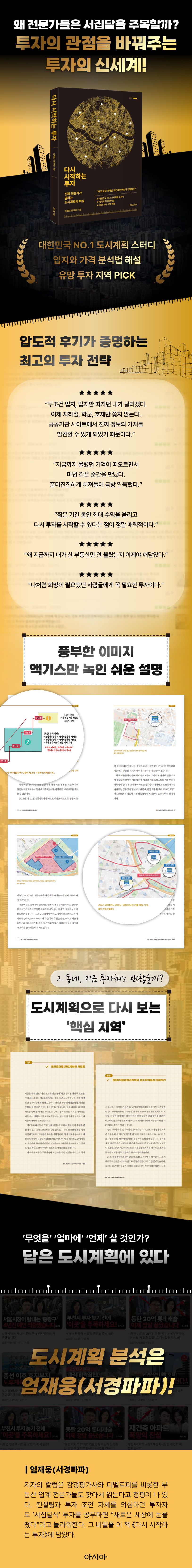 『다시 시작하는 투자』는 투자자들을 위한 실용적이고 현실적인 가이드다. 엄재웅 작가는 외국계 부동산 컨설팅 회사에서 익힌 컨설팅 경험을 바탕으로 이 책을 썼다. 투자 아이디어 수립, 매매, 개발, 도시 재생 등 부동산의 모든 측면을 이 책에서 다룬다.