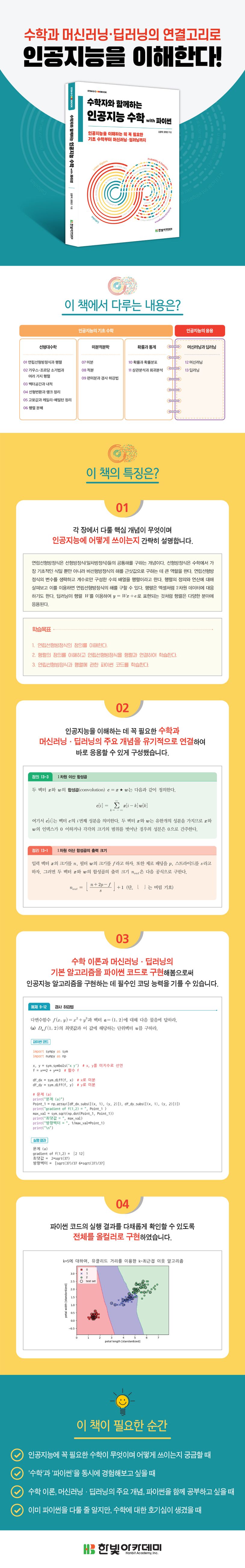 인공지능 기술을 잘 이해하고 활용하려면 이론적 기반이 되는 수학 원리와 알고리즘을 반드시 이해해야 한다. 이 책은 수학자의 친절한 해설로 인공지능에 꼭 필요한 수학 개념부터 머신러닝·딥러닝까지 연계하여 구성하였다. 인공지능의 필수 주제인 선형대수학, 미분적분학, 확률과 통계로 수학적 토대를 다지고, 인공지능의 연구 분야인 머신러닝·딥러닝의 주요 개념을 수학적으로 분석한다. 수학 이론과 머신러닝·딥러닝의 기본 알고리즘을 파이썬 코드로 구현함으로써 인공지능의 핵심에 한층 더 쉽게 다가갈 수 있다. 인공지능에 필요한 수학이 무엇이며, 수학이 인공지능에 어떻게 응용되는지 알고 싶다면 이 책으로 시작해보자!