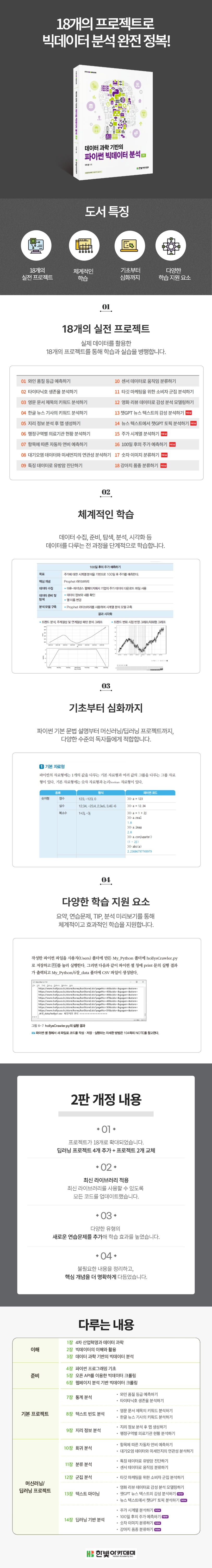 이 책은 통계적 기초 분석부터 딥러닝 기반 고급 분석에 이르기까지 데이터를 분석하고 시각화하는 핵심 방법론을 체계적으로 학습할 수 있도록 안내한다. 학습자가 데이터 과학의 개념과 파이썬 기초를 익힌 후, 18개의 프로젝트를 데이터 수집 → 준비 → 탐색 → 모델링 → 시각화의 순서로 진행할 수 있도록 구성하였다. 각 프로젝트를 실습하기에 앞서, 주요 분석 기법의 핵심 개념부터 탄탄하게 짚어주어 이론과 활용 방법을 균형 있게 습득할 수 있다.