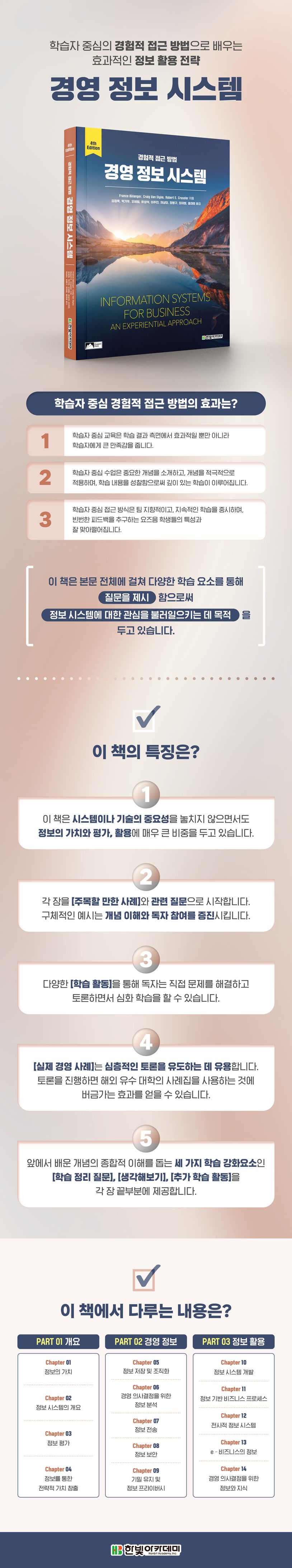 『경영 정보 시스템: 경험적 접근 방법(4판)』은 이러한 요구를 충족하도록 구성되었다. 이 책은 최신 기술과 함께 실질적인 경영 지식을 제공하여, 정보를 활용하는 방법을 자세히 다룬다. 새로운 경영 시스템의 도입부터 비즈니스 프로세스의 최적화, 그리고 현대 기업의 변화에 대비하는 데 필수적인 지침을 제공한다. 또한 학습자 중심의 학습 방법을 강조하여 실무에서 지식을 적용하는 방법을 배울 수 있도록 돕는다. 현대 비즈니스 환경에서 경쟁력을 유지하고 발전시키기 위해 필요한 모든 정보를 이 책 한 권에 담았다.