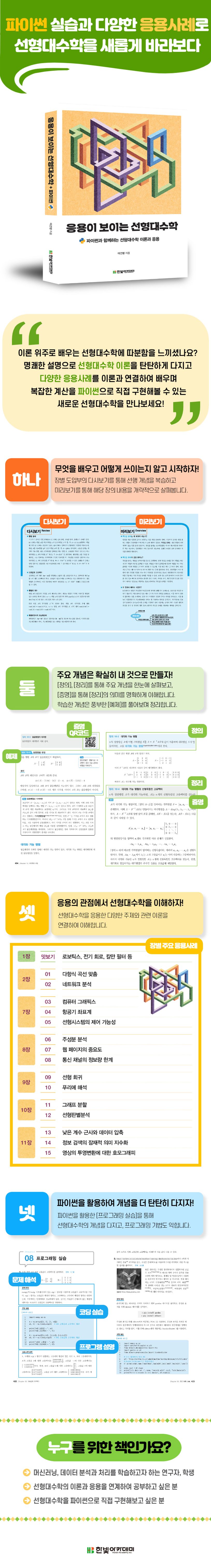 Chapter01선형대수학의개요1.1기본적인수학개념1.2선형대수학의범위1.3선형대수학의응용연습문제프로그래밍실습Chapter02선형방정식2.1연립선형방정식2.2연립선형방정식의풀이법2.3연립선형방정식의응용연습문제프로그래밍실습Chapter03행렬3.1행렬3.2행렬의연산3.3역행렬3.4특별한행렬연습문제프로그래밍실습Chapter04역행렬4.1역행렬의계산4.2역행렬의활용4.3LU분해4.4블록행렬의역행렬연습문제프로그래밍실습Chapter05행렬식5.1행렬식5.2행렬식의성질5.3블록행렬의행렬식5.4행렬식의기하학적의미5.5행렬식의활용연습문제프로그래밍실습Chapter06벡터6.1벡터6.2벡터공간6.3벡터의내적6.4벡터의외적6.5벡터와기하학6.6벡터와행렬미분연습문제프로그래밍실습Chapter07선형변환7.1선형변환7.2선형변환의부분공간과계수연습문제프로그래밍실습Chapter08고윳값과고유벡터8.1고윳값과고유벡터8.2고윳값과고유벡터의성질8.3고윳값과고유벡터의응용연습문제프로그래밍실습Chapter09직교성9.1직교기저9.2직교분해9.3행렬방정식의최소제곱해와최적근사해9.4직교성의응용연습문제프로그래밍실습Chapter10대각화와대칭10.1닮음과대각화10.2대칭행렬10.3이차형식10.4대칭행렬의응용연습문제프로그래밍실습Chapter11특잇값분해11.1특잇값분해11.2특잇값분해의응용연습문제프로그래밍실습찾아보기