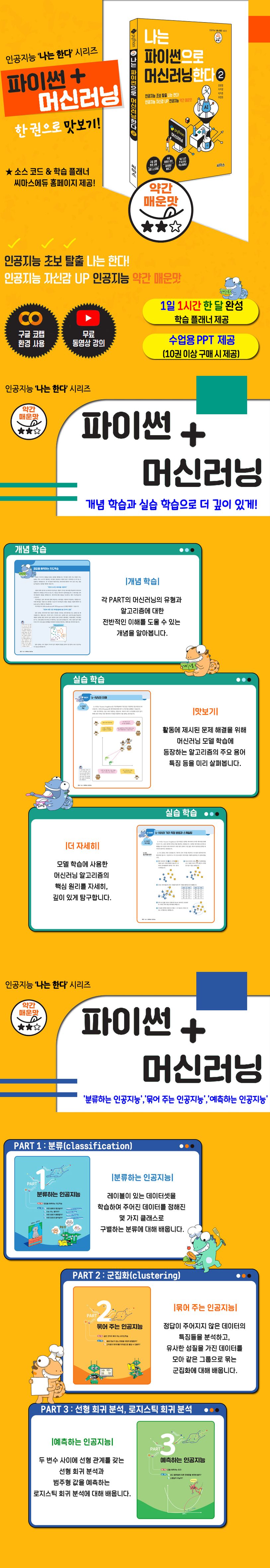파이썬 문법과 머신러닝 기초 입문 도서 ‘나는 파이썬으로 머신러닝한다 1(순한맛)’에 이은 ‘나는 파이썬으로 머신러닝한다 2(약간 매운맛)’은 머신러닝 알고리즘의 핵심 원리와 실제 적용을 체계적으로 익힐 수 있는 안내서입니다.