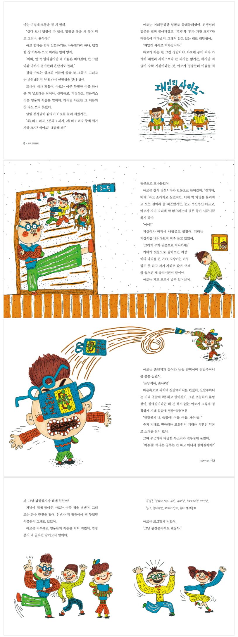 그냥 친구를 괴롭히는 주먹 짱 기태가 사실 같이 놀 친구가 필요한 외로운 아이였고, 툭하면 배가 아프다면 보건실에 갔던 엄살쟁이 지상이는 엄마가 없지만 꿋꿋하게 살아가는 굳센 아이였습니다. 아로 외에도 저마다 자신만의 이야기를 가지고 있는 친구들의 모습은 아이들 누구에게나 자신만의 강점이 있다는 사실을 보여줍니다.