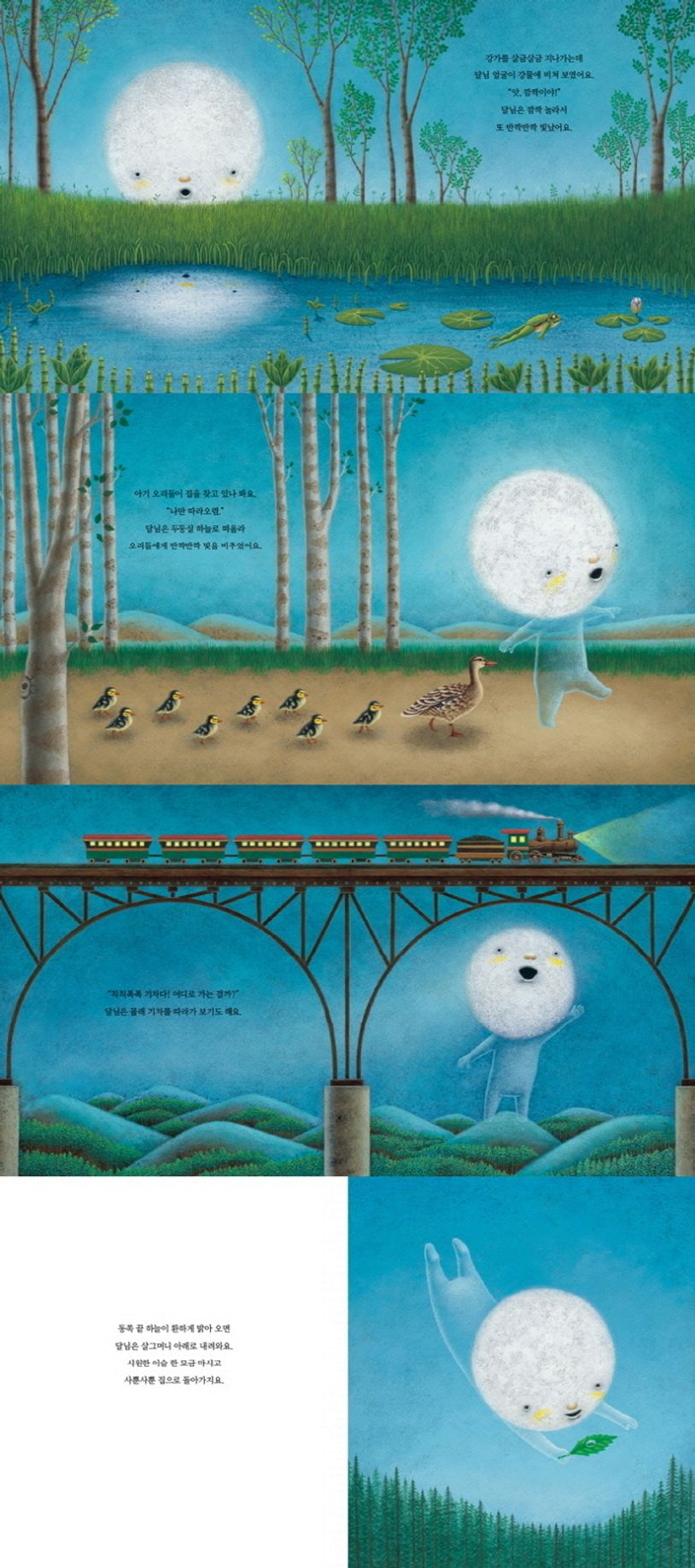‘달님’을 ‘아기’로 형상화한 상상력 그림책『달님의 산책』. 해질 녘에 달님이 어슬렁어슬렁 산책을 나옵니다. 어두컴컴해진 숲속에 밝은 빛을 비춰 주며 집 잃은 아기 토끼에게 엄마를 찾아 주고, 길 잃은 아기 오리가 집을 찾을 수 있도록 이끌어 줍니다. 숲속 친구들과 하나둘 정답게 인사를 나무며 달님은 두둥실 하늘로 떠오르지요. 밤 깊은 줄 모르고 칙칙폭폭 달리는 기차를 따라가 보기도 하고, 지붕 위에서 노닥거리는 고양이들과 숨바꼭질도 해 봅니다. 그러다 새벽이 되어서 동쪽 하늘이 밝아 오면 집으로 돌아가 잠을 청하지요.