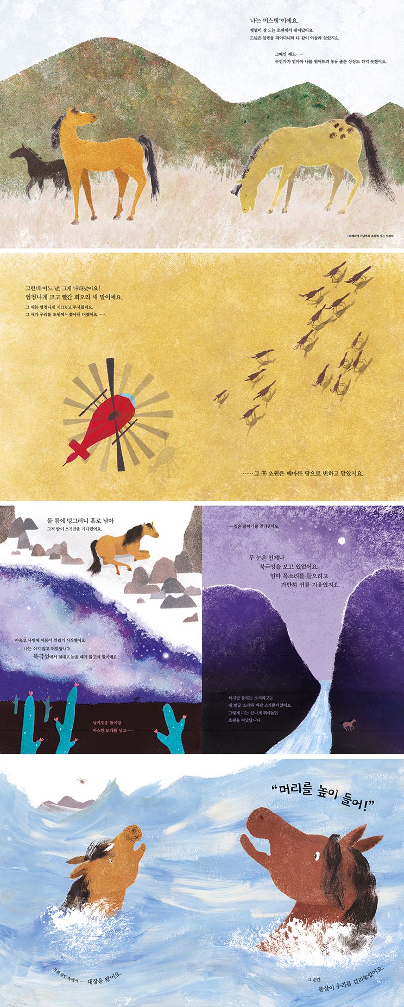 엄청나게 크고 빨간 회오리 새는 과연 무엇일까요? 그것이 나타나는 순간, 겁을 먹은 머스탱 무리는 사방으로 흩어져 버려요. 그 서슬에 ‘나’는 그만 엄마를 놓치고 말지요. 엄마는 그 다급한 순간에 무조건 북극성을 따라가라고 외칩니다. 나중에 반드시 찾으러 갈 거라고…….
