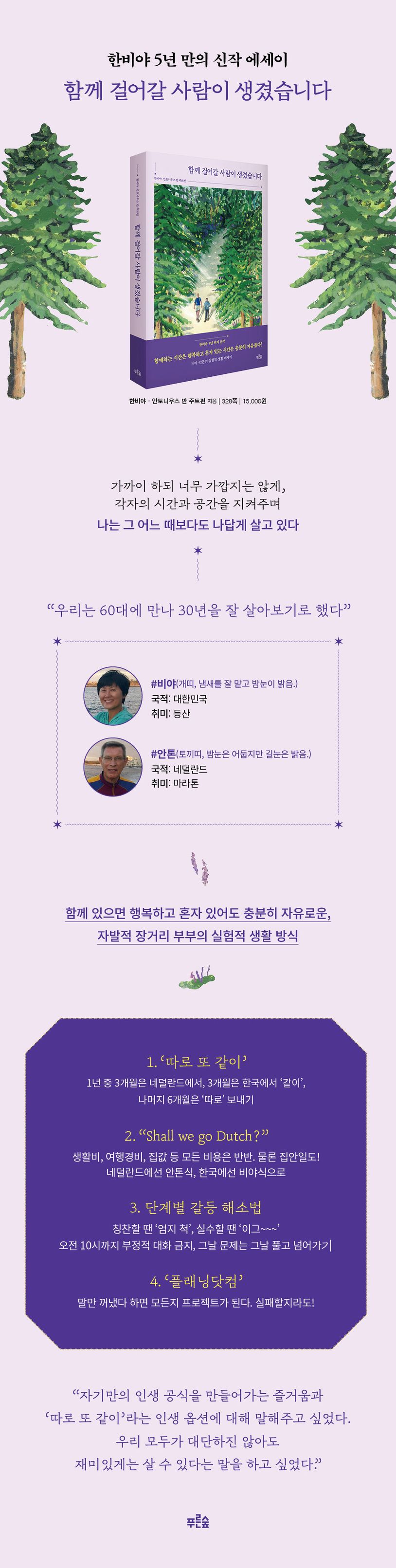 프롤로그1장.우리의‘따로또같이’결혼생활굿모닝,마이선샤인!구호요원커플의우선순위와최소기준네덜란드레인더난초길집2층남자와3층여자우리는서로에게시간을투자한다네덜란드에선안톤식으로한국에선비야식으로서로를보호해주고싶은순간들“ShallwegoDutch?”선물을꼭하고싶다면비바체와안단테그래도별탈없이살아왔거든요!차이나는시간관리법민망하지않게실수를짚어주는기술가끔나는내가무섭다사랑과초콜릿은나눌때더달콤한법2장.플래닝닷컴:오늘도계획중우리는플래닝닷컴커플신혼여행이야?어학연수야?Vamos,한번해보는거야!공부하고경쟁하고사랑하라쿠바에선발코니쇼핑을“당신들정말미쳤군요!”살사는금기어가되어버렸다그날문제는그날털고가자치열하고도따뜻했던쿠바에서의시간들도와줄의무,도움받을권리그는최고의보스였다비야,진지하게질문하는사람스페셜리스트,가슴떨리는제안구원투수를만나다그라나다,동료에서친구로넘어가는길결혼을한다면이사람이랑“근데,어느나라사람이야?”설탕처럼,소금처럼살겠습니다한비야박사만들기프로젝트신뢰가목숨을구한다안톤,내인생의응원단장피,땀,눈물,그리고감사,감사3장.네덜란드서울댁,서울안서방“문제없어요,네덜란드니까요”세계최초가많은나라웰컴투레인더미세스비야반주트펀-한불광동의감자보이앞마당에무궁화를심어볼까?자발적은퇴생활자의삶네덜란드청어이야기마을미관위원회의힘5개국어능통자,한국어에쩔쩔매다사순절과와인한모금집에서출발하는순례길그나폴레옹맞아?용서하는마음,용서를청하는마음4장.혼자있는힘,함께하는힘과일칵테일식결혼생활외부밧줄은언제든사라진다만약내가그자리에없었다면‘그날’을위한준비품위있고귀엽게나이들기연습“이제우리가잡아드릴게요”백두대간도나눠서간다면맥주는우정을살찌운다10년후에어디에서살까담담하고평화롭게대단하진않아도즐거운삶에필로그