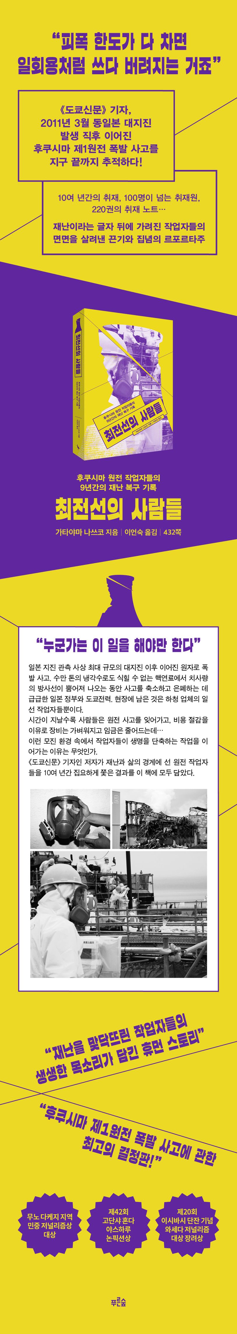 『최전선의 사람들』은 《도쿄신문》 사회부 기자인 저자가 2011년 3월 동일본 대지진 발생 직후부터 2019년까지 9년간 원전 현장에 잠입해 숨겨진 진실을 끈질기게 파헤쳐나간 기록이다. 현재까지 인터뷰한 취재원만 100여 명, 취재 노트만 약 220권, 관련 기획 기사만 140여 회에 달한다. 저자는 사고를 축소하고 은폐하는 데 급급한 일본 정부, 해결된 게 하나도 없지만 점차 사고의 악몽을 잊어가는 국민들, 목숨이 경각에 달렸음에도 어떻게든 사고를 수습하려 노력하는 작업자들의 얼굴을 교차해 보여준다. 특히 일지 형식을 빌려 재난의 최전선에서 마치 일회용처럼 쓰이고 버려지는 노동자의 현실을 철저히 기록함으로써 그간 뉴스로만 접했던 ‘원전 사고’를 작업자 한 명 한 명의 얼굴로 생생히 복원한다. 잃어버린 삶의 터전과 참혹한 사고 현장을 낱낱이 파헤친 이 기록은 오늘날 우리가 어떤 이들의 희생과 맞바꾼 전기 에너지를 사용하고 있는지 질문한다.