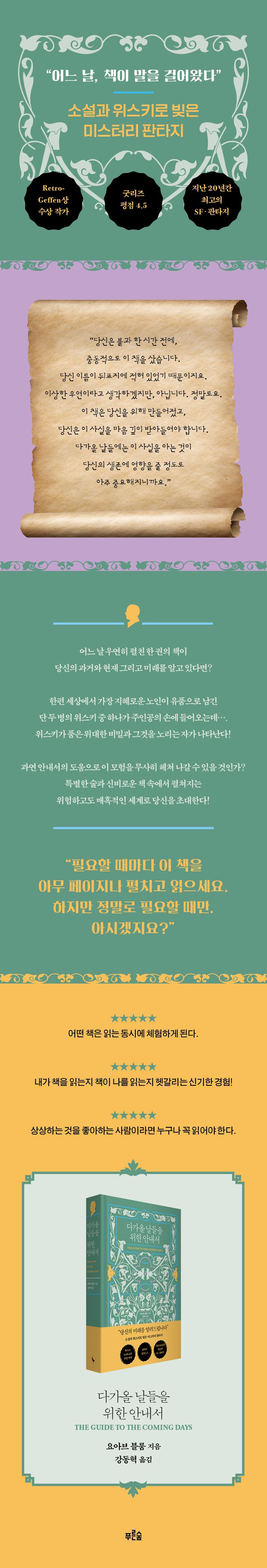 《우연 제작자들》로 이스라엘 최고의 SF, 판타지 소설에 부여하는 레트로-게펜상 수상은 물론 자국에서 5만 부 이상 판매되며 작품성과 대중성을 동시에 잡은 신예 작가로 화려하게 데뷔한 요아브 블룸의 두 번째 소설이 도서출판 푸른숲에서 출간되었다. 《다가올 날들을 위한 안내서》는 특유의 통찰력과 따뜻한 시선으로 써낸 힐링 판타지 소설로, 살아가는 것의 의미에 대한 깊은 성찰을 어디서도 본 적 없는 참신한 스토리로 담아냈다. 생에 한 번 진정한 자기 자신의 삶을 살아보고자 분투하는 한 인간의 성장기인 이 소설의 마지막 장을 덮고 나면 독자들은 누구나 스스로의 삶을 이끌어나가는 탁월한 모험가가 될 수 있다는 용기를 마음을 울리는 감동과 함께 얻게 될 것이다.
