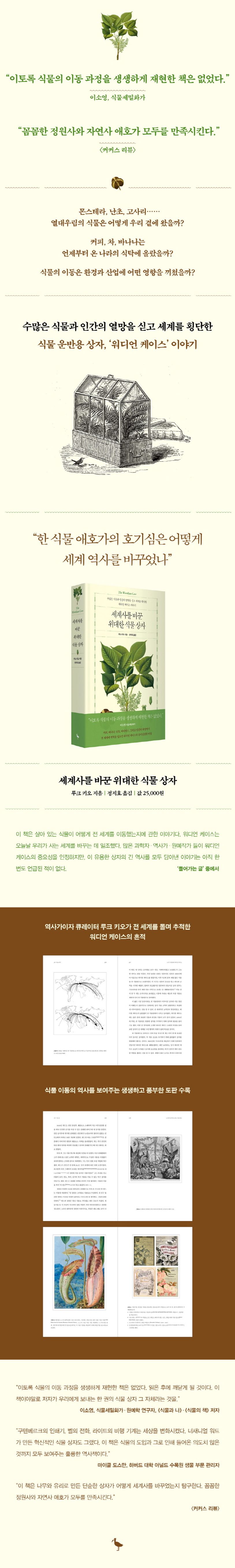 워디언 케이스가 전 세계의 식물을 옮기며 세계사에 변혁을 일으킨 자취를 세밀하게 살피는 이 책은 아름다운 식물을 곁에 두고 감상하고 싶다는 욕망과 유익한 식물을 재배해 이익을 창출하겠다는 제국주의의 열망, 이로 인해 이루어진 식물 이식, 그리고 인간이 감당해야 했던 환경의 변화까지 꼼꼼하게 되짚는다. 한 식물 애호가의 호기심으로 탄생한 ‘워디언 케이스’가 식물과 관련된 모든 역사의 중심에 있었다는 것을 시간 순서대로 서술, 세계사를 보는 새로운 관점을 제공한다.
