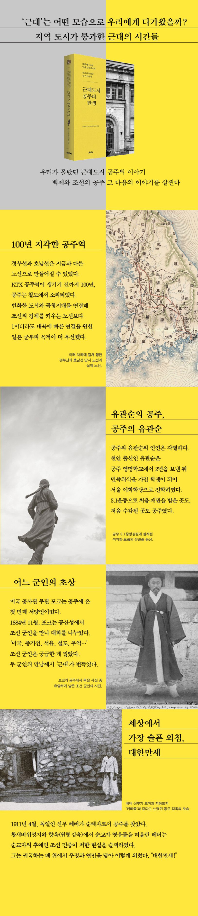 서울 같은 대도시, 혹은 부산이나 대전, 인천 같은 개항지 혹은 교통요지가 아닌 지역 도시들은 어떻게 근대를 맞이했을까? 《근대도시 공주의 탄생》은 조선시대까지 충청지역을 대표하던 공주가 어떻게 ‘근대’를 맞이했는지 그 구체적인 이야기를 살핀다. 호서의 수부도시였던 공주는 근대의 도전에 직면해 변화를 강요받고 원하지 않는 모습을 수용해야 했다.