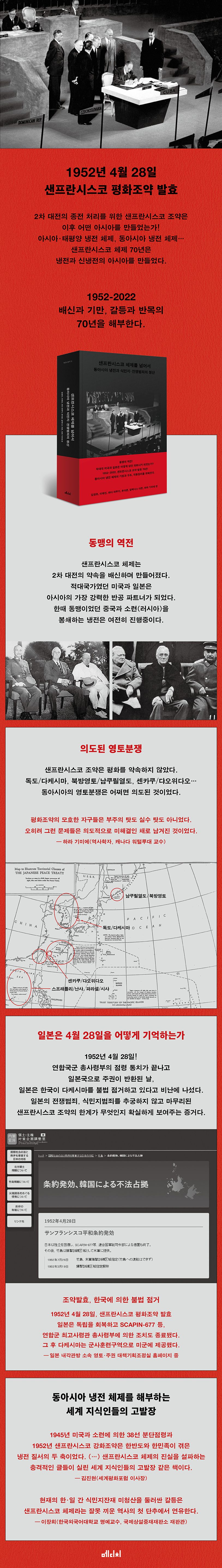 2022년 4월 28일. 샌프란시스코 조약이 발효된 지 70년째가 되는 날이다. 1952년 4월 28일, 조약이 정식으로 발효되면서 일본 주둔 연합국군 총사령부는 점령 통치를 끝내고 일본국에 주권을 돌려주었다. 전범국가 일본을 민주주의 국가로, 또 다시는 전쟁을 할 수 없도록 농업국가로 개조하겠다던 연합국의 목표는 국공내전과 한국전쟁 그리고 전 세계적인 냉전의 시작을 계기로 후퇴하였다. 전쟁범죄·식민지범죄의 추궁을 면제받은 일본은 관대한 조약 내용에 만족하였고, 이후 미국과 함께 아시아·태평양 반공 동맹의 중요한 파트너가 되었다. 《샌프란시스코 체제를 넘어서》는 동아시아와 대한민국을 70년 동안 옥죄고 있는 샌프란시스코 체제를 날카롭게 파헤친다. 동아시아 냉전을 오래 연구한 세계적인 역사학자들과 역사, 법, 국제조약, 국제정치 등 여러 차원에서 샌프란시스코 체제의 문제점을 연구한 한국 학자들의 성과를 모았다. ‘정의로운 평화’를 열망하는 세계 지식인들의 고발장 같은 책이다.