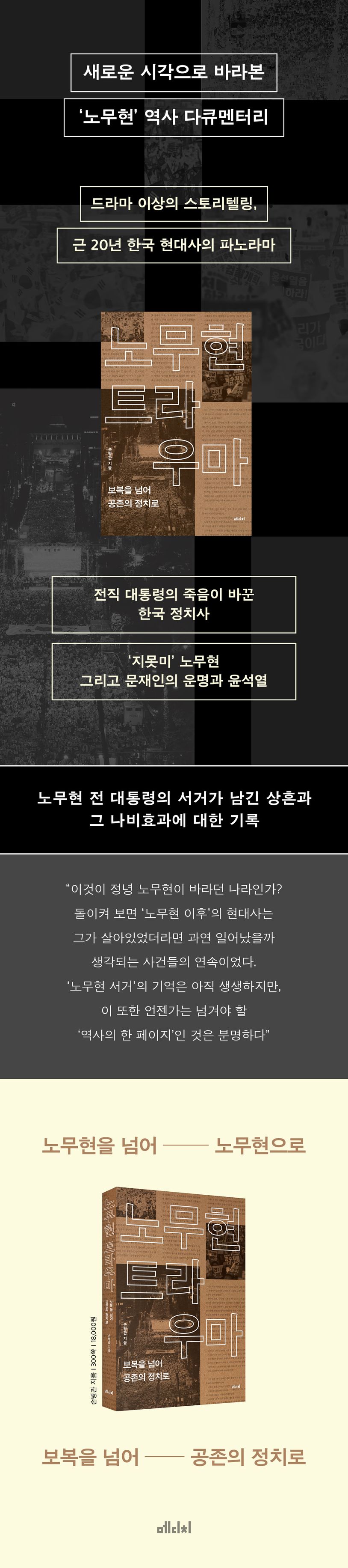 《노무현 트라우마》는 바로 이 지점, 노 전 대통령 서거가 남긴 상흔을 되짚어 본다. 이 책은 ‘노무현을 지켜주지 못했다’는 지지자들의 죄책감이 우상에 대한 열광과 적폐에 대한 단죄로 반복적으로 발현되면서 정치가 선악이 맞서는 경기장으로 전락했다는 저자의 문제의식에서 출발한다. 다시 말해 이 책은 노 전 대통령이 죽음에 이르게 된 과정과 그것이 대중에게 일으킨 의식의 변화, 그리고 이로 인해 파생된 나비 효과에 대한 관찰기를 다룬 첫 책이다.