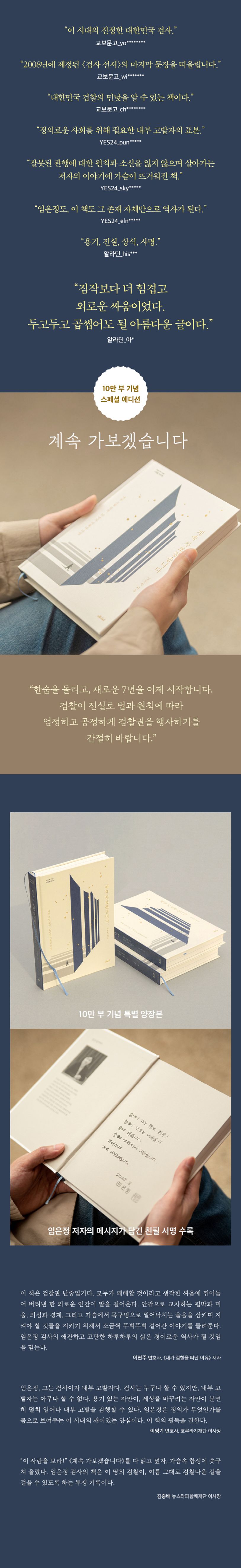 검사임은정은내부고발자로서살아온10년을이책을통해결산하고,다시금새로운출발선에서있다.역사의걸림돌이아닌디딤돌이되어,검찰을바로세운뒤에흐뭇한‘해피엔딩’이담긴결과보고서를하루빨리시민에게내놓기를바라고있다.그러면서시민에게변화된미래를함께꿈꾸어보자고말한다.결국《계속가보겠습니다》는검찰의변화를향해가는역사의힘찬발걸음을함께내딛자는,한검사의동행제안인것이다.