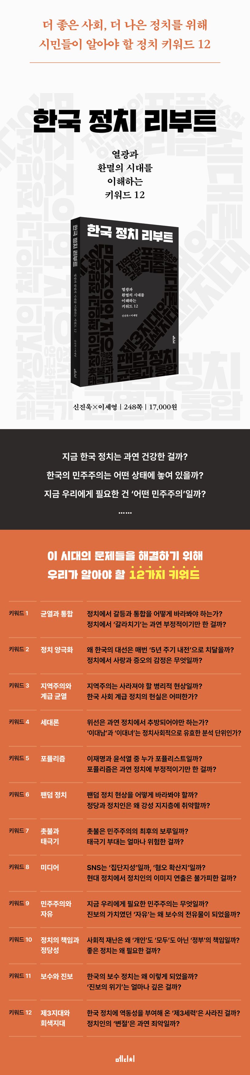 이러한 부정적 현실을 극복할 방안은 없는 걸까? 현실의 여러 문제를 해결하기 위해서는 올바른 문제의식에서 출발해야 한다. 우리가 더 좋은 사회, 더 나은 정치를 꿈꾸기 위해선 현실을 직시한 정확한 문제의식에서부터 시작해야 한다. 그렇다면 한국 정치 현실을 올바르게 읽어내고 정확한 물음을 던지기 위해 시민들이 알아야 할 것은 무엇인가. 《한국 정치 리부트》는 이 시대의 문제들을 해결하기 위해 시민들이 알아야 할 한국 정치 키워드 12가지를 담은 정치 해설서다. 이 책은 시민들이 한국 정치의 문제점을 올바르게 파악하고 새롭게 방향을 설정해 정치를 ‘리부트’하기 위한 첫걸음이 될 것이다.