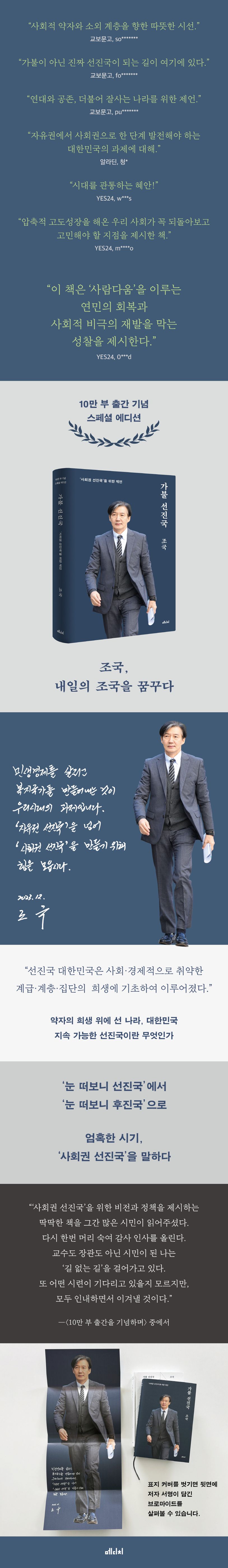 이제는 장관도 교수도 아닌 자연인이 된 《가불 선진국》의 저자 조국은 이번 ‘10만 부 출간 스페셜 에디션’을 통해 그동안 안착했던 자유권이 불과 몇 년 만에 다시 위태로워졌다고 말한다. ‘공산 전체주의’가 아닌 ‘용산 전체주의’가 한국 민주주의를 퇴행시키고 있다는 것이다. 한국은 ‘눈 떠보니 선진국’에서 다시 ‘눈 떠보니 후진국’으로 뒷걸음질 치고 있다.