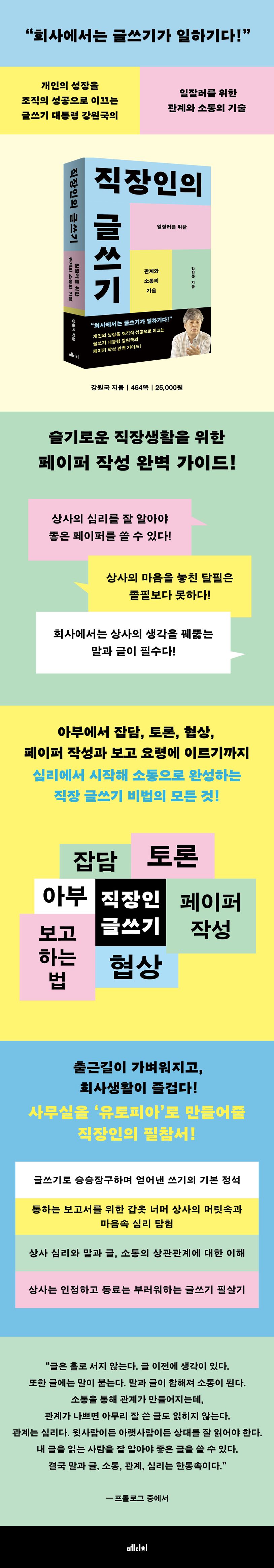 회사에서는 글쓰기가 곧 일하기와 동의어다. 하지만 단순히 글만 잘 쓰면 아무짝에도 쓸모가 없다. 상사의 생각을 꿰뚫는 말과 글이 필수다. 상사의 생각을 꿰뚫기 위해서는 좋은 관계와 소통이 먼저다. 이 책에는 일잘러를 위한 회사 내 관계와 소통의 기술이 담겼다. 상사의 심리에서 시작해 소통으로 완성하는 직장 글쓰기 비법의 모든 것을 만날 수 있다.