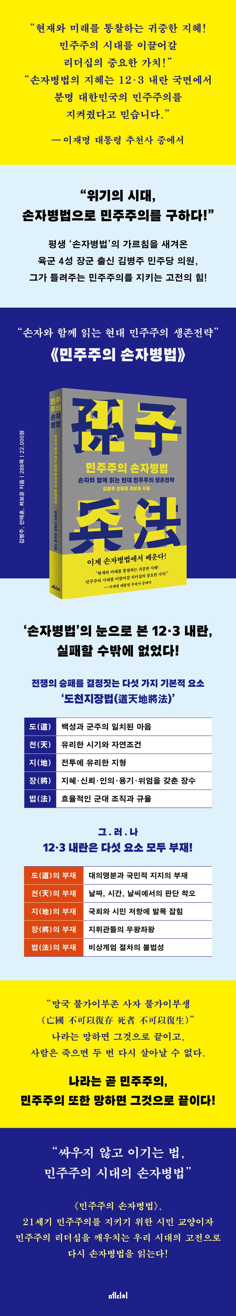 대담하고 흥미진진하다! ‘주블리’ 김병주 의원이 ‘손자병법’으로 계엄과 내란 사태를 분석하고, 새로운 민주주의 시대의 리더십을 제안한다. 지금 왜 손자병법일까? 중국 속담에 ‘손자천독달통신(孫子千讀達通神)’이라는 말이 있다. ‘손자병법’을 천 번 읽으면 신의 경지와 통한다는 말이다. 2,500년 전에 쓰인 병법서이지만 지금도 군사학만이 아니라 경영학, 관리학, 정치학, 외교학, 처세학 등 다양한 분야에서 재해석되어 활용되고 있다. 육군 4성 장군 출신 김병주 민주당 의원은 평생 ‘손자병법’의 가르침을 새기며 39년간 군에 복무하였다. ‘12.3 계엄’ 국면과 이후 진행 과정에서 김병주 의원은 ‘손자병법’의 한 구절 한 구절을 통해 전략을 세우고 전술을 짜며 위기를 돌파해 민주주의의 승리를 가져오는 데 일조했다.