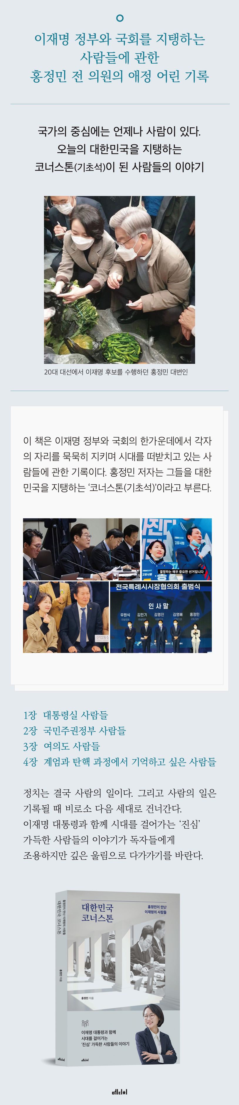 이 책은 홍정민 전 의원이 직접 만나 함께 걸어온 ‘이재명 정부와 국회를 지탱하는 사람들’에 관한 애정 어린 기록이다. 21대 국회의원으로 원내대변인, 대선캠프에서 활약했던 저자는 화려한 직함이나 언론의 프레임만으로는 보이지 않는 정치 현장에서 일하는 사람들의 ‘진짜 모습’을 가까이에서 지켜보았다.