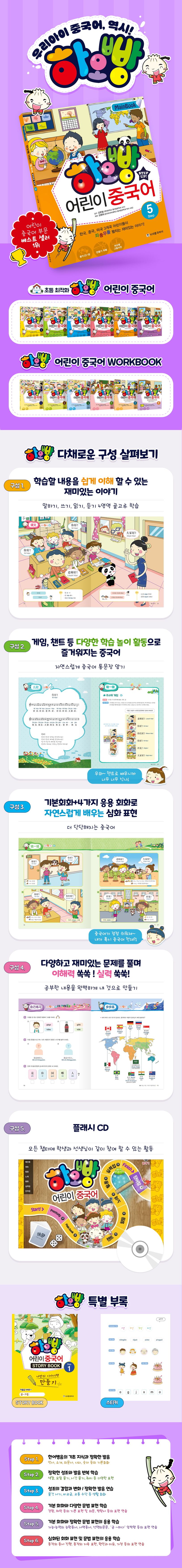 『하오빵 어린이 중국어 5권』은 《하오빵 어린이 중국어 1-3권》 교재를 통해 중국어를 입문하여 다양한 중국어 표현들이 자연스럽게 익혀진 어린이들에게 자연스럽게 좀더 구체적인 상황 표현과 새로운 생활 표현들을 학습하도록 유도합니다. 반가운 새 친구들인 민국, 나리, 동동, 야야, 마크, 에이미 6명의 주인공들의 좌충우돌 생활 속에서 접하게 되는 여러 가지 상황들을 통해 좋아하는 수업, 경험표현, 허락 구하기 등의 다양한 회화 및 회화 속에 들어있는 문법표현을 배울수 있습니다.