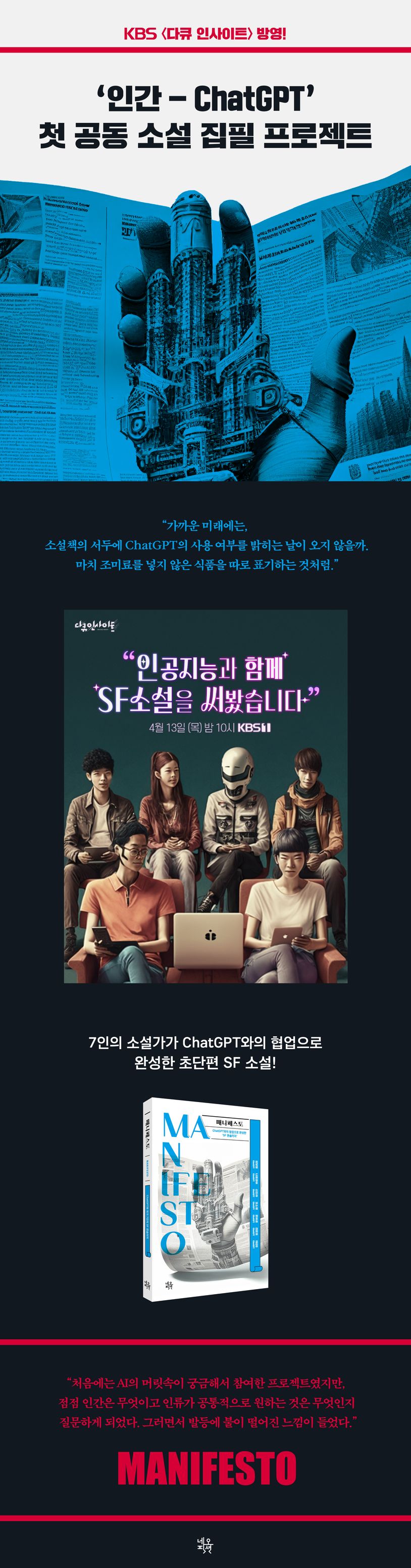그렇지 않다는 대답 대신, 한번 해보자는 결심을 했다. 인간 고유의 영역인 창작, 그중에서도 소설을 AI와 함께 써보는 거다. 그리고 함께하는 과정을, 그 시행과 착오를 모두 담아보는 거다. 『매니페스토Manifesto』는 시도와 과정과 결과를 모두 담은, 성공과 실패의 조각이 모두 혼합된 새로운 형태의 소설집이다. 인간과 AI가 협업해 어떤 소설을 만들었는지, 그것을 어떻게 만들었는지, 만들며 작가들이 느낀 게 무엇인지까지 전부 이 한 권에 담았다.