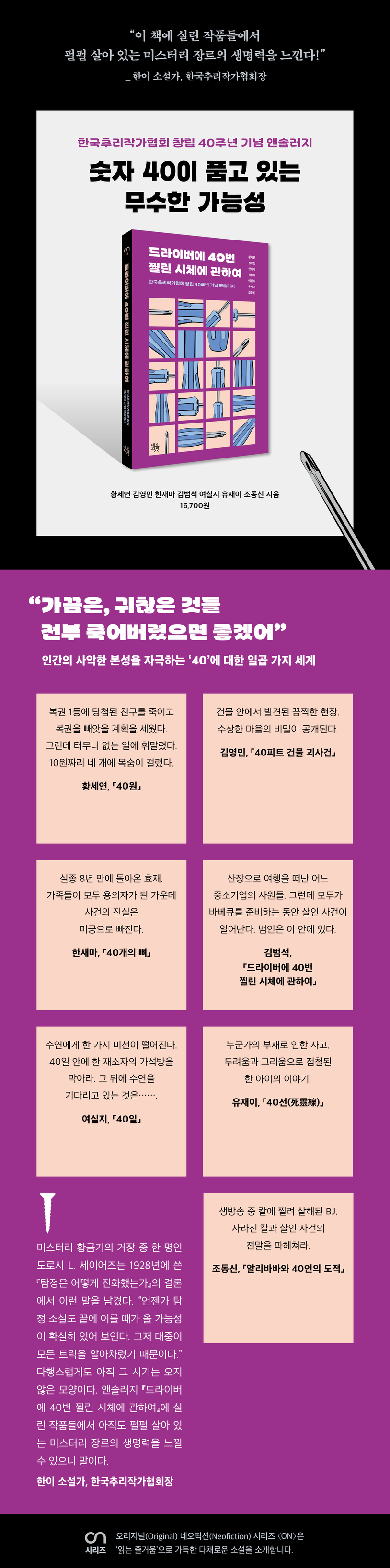 한국추리작가협회 창립 40주년을 기념하여 숫자 40과 관련된 추리/미스터리 앤솔러지를 선보인다. 1983년 설립된 한국추리작가협회는 계간 『미스터리』와 『올해의 추리소설』을 발간하고 있다. 또한 한국추리문학대상, 황금펜상을 매년 개최하며 추리 소설의 다양한 가능성을 발굴하고 있다.
