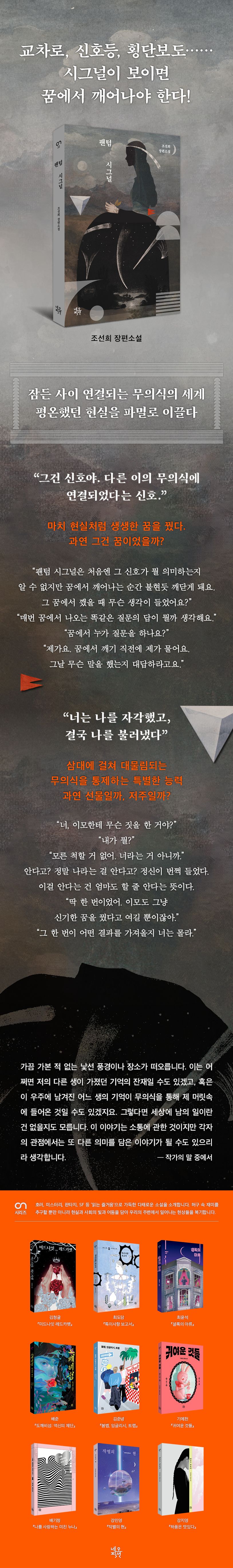 네오픽션 ON시리즈 33권으로 조선희 작가의 장편소설 『팬텀 시그널』이 출간되었다. 판타지적 접근으로 인간의 어두운 내면을 파헤치는 작품을 선보여온 작가가 이번 작품에서 선택한 소재는 바로 ‘꿈’이다. 인간의 가장 내밀한 욕망이 꿈틀대는 무의식의 공간에서, 작가는 어디서도 본 적 없는 기이한 존재를 만들어낸다.