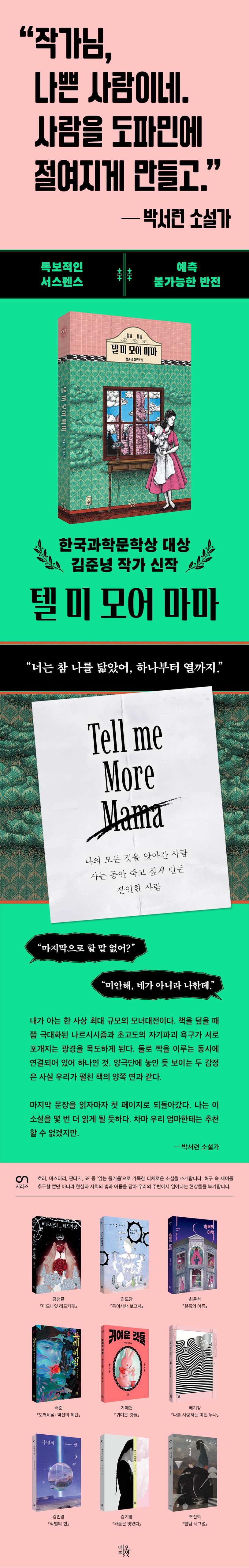 제5회 한국과학문학상에서 장편 부문 대상을 수상하며 본격적으로 자신의 이름을 알린 김준녕 작가가 흡인력 강한 스릴러 소설로 돌아왔다. 네오픽션 ON시리즈 34권으로 선보이는 김준녕 작가의 『텔 미 모어 마마』는 서로를 미치도록 증오하는 모녀의 이야기다. 하나부터 열까지 자신의 모든 것을 감시하고 빼앗는 엄마에게 딸이 얼마 만큼 분노할 수 있는지를 이 책을 통해 확인할 수 있다. 책을 먼저 읽은 박서련 소설가는 이 책을 두고 ‘사상 최대 규모의 모녀대전’이라고 표현할 만큼 독보적인 스케일과 긴장감을 자랑하는 작품이다. 게다가 누구도 예측하지 못할 반전이 기다리고 있으니, 끝까지 긴장을 놓지 않은 채 ‘엄마’가 딸에게 전하지 않은 말은 무엇인지 직접 확인해보기를 바란다.