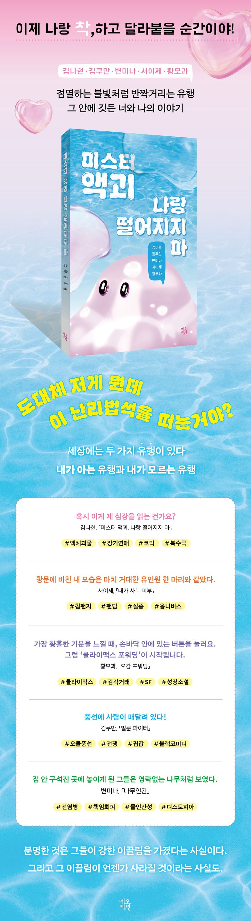 장르 전문 출판사 네오북스에서 선보이는 테마 앤솔러지 『미스터 액괴 나랑 떨어지지 마』가 출간되었다. 제목에서 드러나듯 귀엽고 발랄한 아이템이 가득한 이번 앤솔러지에는 ‘괴상하고 난해하지만, 그래서 더 끌리는 무언가’에 대한 다섯 편의 작품이 실렸다. 무한한 가능성으로 세상을 바라보는 다섯 작가가 창조한 이끌림의 세계, 결코 밀어낼 수 없는 매력적인 무언가가 독자를 기다리고 있다.
