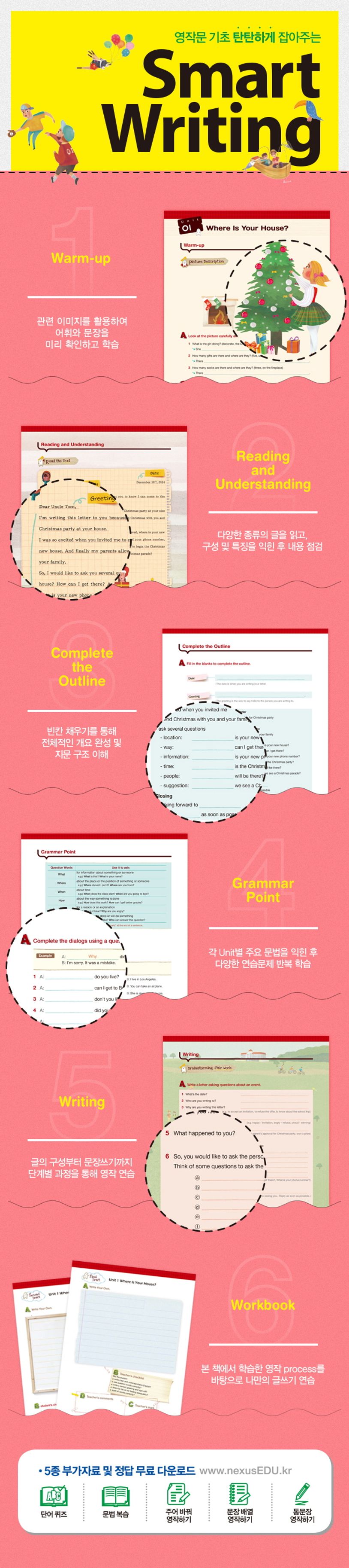 1.이책은누가보나요?-초등6학년부터중등3학년학생-학교내신서술형평가를완벽히대비하고자하는학생-다양한문장구조연습을통해탄탄한영작기본기를쌓기원하는학생-문법과글쓰기의기초를동시에잡고자하는학생2.이책의구성은무엇인가요?1.Warm-up본격적인영작연습에앞서관련이미지를활용하여어휘와문장을미리확인하고학습합니다.2.ReadingandUnderstanding다양한종류의글을읽고,종류에따른구성및특징을익히며잘이해했는지확인합니다.3.CompletetheOutline빈칸채우기를통해앞에서읽은글의전체적인개요를완성하여지문의구조를익힙니다.4.GrammarPoint각Unit별주요문법을익히고다양한연습문제를반복하여학습합니다.5.Writing글의목적과종류에맞게글의구성부터문장쓰기까지단계별과정을통해영작연습을합니다.6.Workbook본책에서학습한영작process를바탕으로나만의글쓰기를연습합니다.7.5종부가자료및정답《www.nexusEDU.kr》에서5종부가자료(단어퀴즈,문법복습,주어바꿔영작,문장배열영작,통문장영작)및정답을무료다운로드하실수있습니다.