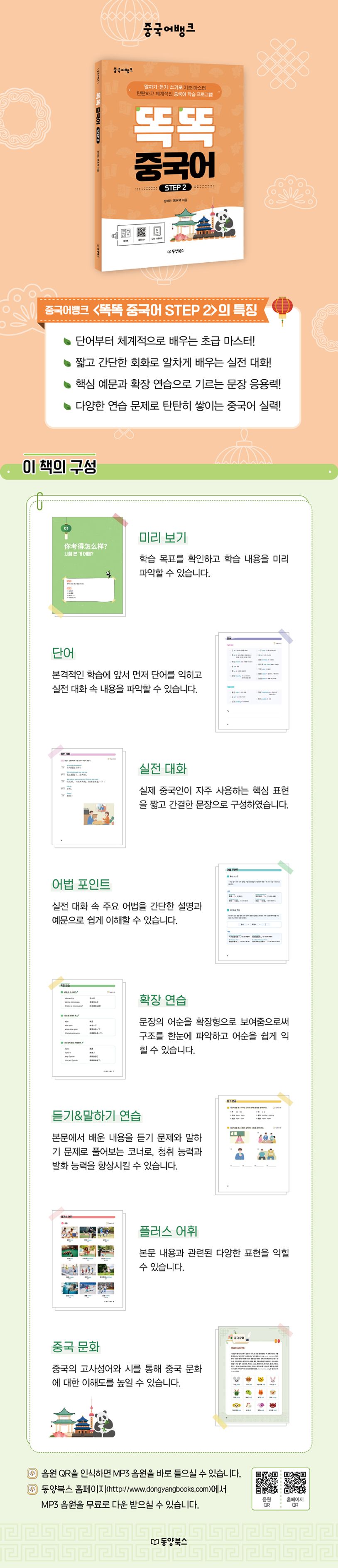 「중국어뱅크 똑똑 중국어 STEP 2」는 일상 대화부터 여행까지 다양한 상황별 표현을 모아 회화를 알차게 구성했습니다. 아울러 반복 학습으로 말하기·듣기·쓰기 영역을 골고루 학습할 수 있도록 설계했습니다. 본 책의 체계적인 학습을 통해 중국어의 문을 똑똑! 두드리고 중국어의 기본기를 탄탄하게 다질 수 있습니다.