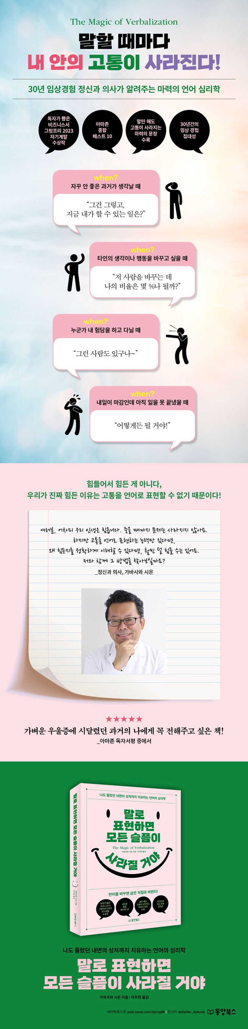 30년이 넘는 임상 경험의 정신과 의사, 가바사와 시온은 바로 이 점에 주목했다. 그는 최신작이자 대표작 『말로 표현하면 모든 슬픔이 사라질 거야』에서 고통을 언어로 표현하는 방법만 터득해도 상처의 90%가 치유된다고 말한다. 모든 심리 상담의 1차 목표가 바로 ‘언어화’라는 것이다. 만약 언어화가 가능하다면 그것은 이미 과거의 속박에서 벗어났다는 뜻이기 때문이다. 또한 자신의 생각과 느낌을 말과 글과 행동으로 표출하는 능력은 심리적 안정감뿐 아니라 인간관계와 사회생활에 지대한 영향을 미친다는 것을 여러 사례를 통해 잘 보여준다.
