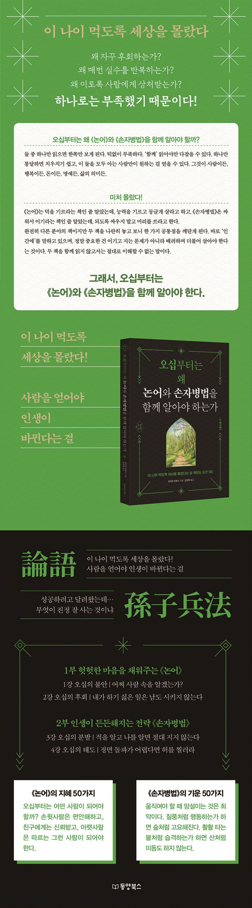 미처 몰랐다! 《논어》는 덕을 기르라는 책인 줄 알았는데, 능력을 기르고 둥글게 살라고 하고. 《손자병법》은 싸워서 이기라는 책인 줄 알았는데, 되도록 싸우지 말고 머리를 쓰라고 한다. 완전히 다른 분야의 책이지만 두 책을 나란히 놓고 보니 한 가지 공통점을 깨닫게 된다. 바로 ‘인간애’를 말하고 있으며, 정말 중요한 건 이기고 지는 문제가 아니라 배려하며 더불어 살아야 한다는 것이다. 두 책을 함께 읽지 않고서는 절대로 이해할 수 없는 말이다. 그래서, 오십부터는 《논어》와 《손자병법》을 함께 알아야 한다.