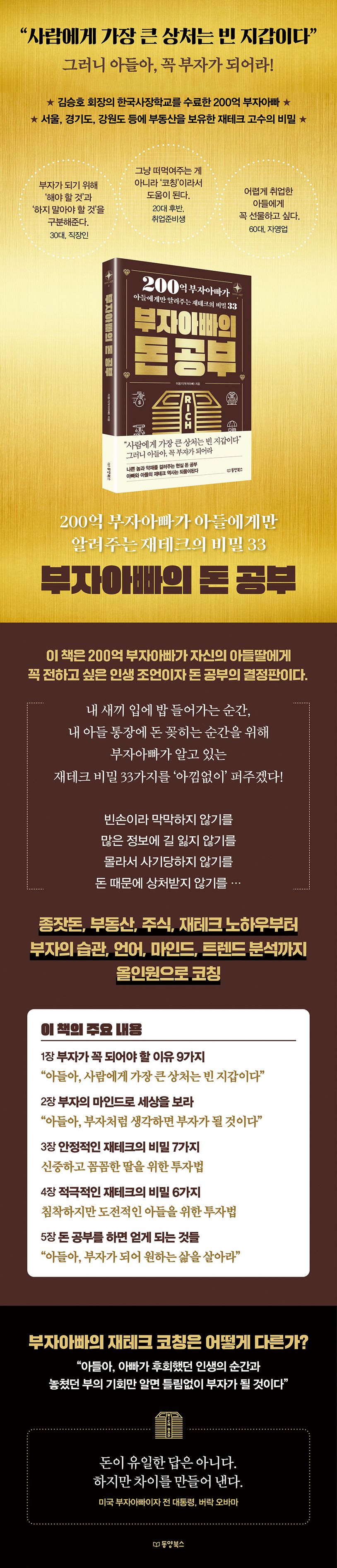 이 책은 200억 부자아빠가 자신의 아들딸에게 꼭 전하고 싶은 인생 조언이자 돈 공부의 결정판이다. 부자아빠는 금융 계통에서 14년 직장생활을 하고 22년 사장으로 살며, 성공과 실패를 모두 겪어본 투자자이자 창업가다. 다양한 재테크에 지치지 않고 도전한 덕분에 서울, 경기도, 강원도에 다수의 부동산을 보유하며 큰 자산을 일구었다.