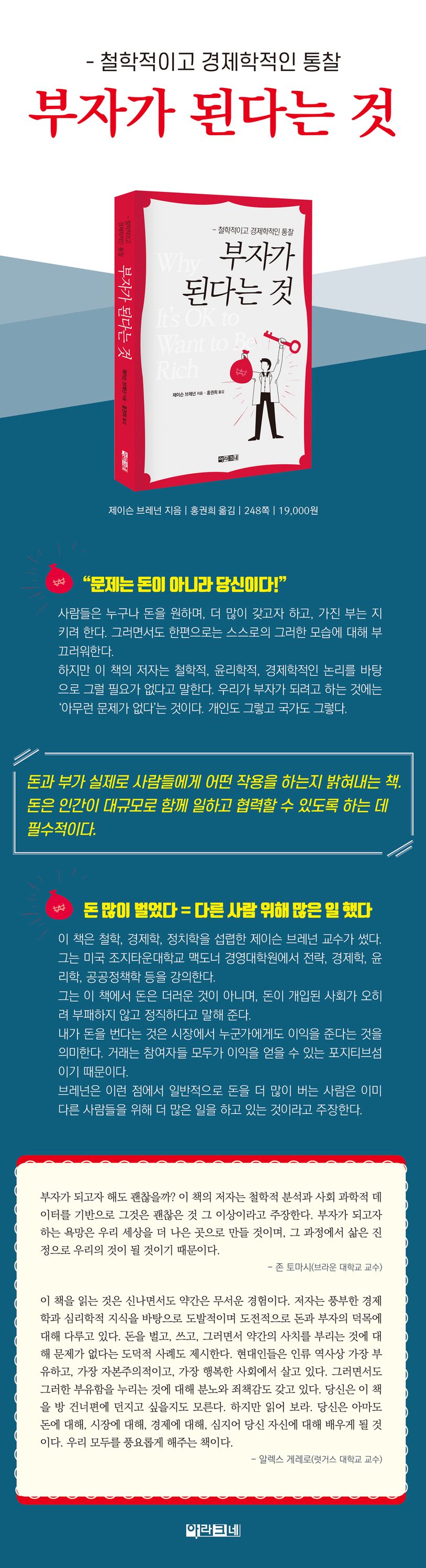 사람들은 누구나 돈을 원하며, 더 많이 갖고자 하고, 가진 부는 지키려 한다. 그러면서도 한편으로는 스스로의 그러한 모습에 대해 부끄러워한다. 하지만 이 책의 저자는 철학적, 윤리학적, 경제학적인 논리를 바탕으로 그럴 필요가 없다고 말한다. 우리가 부자가 되려고 하는 것에는 ‘아무런 문제가 없다’는 것이다.