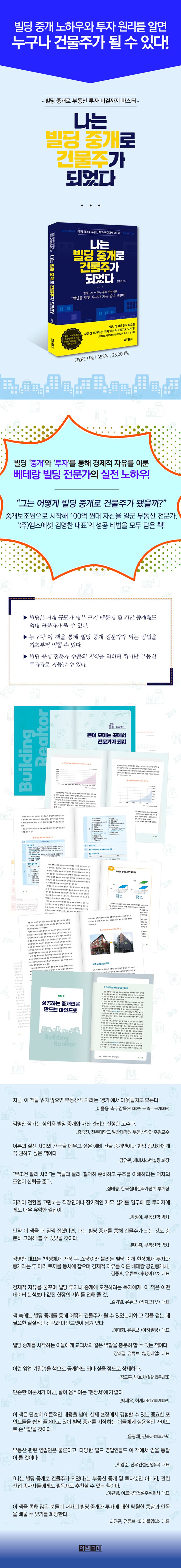 『나는 빌딩 중개로 건물주가 되었다』는 부동산 업계에서 돈을 벌기로 결심하고 중개보조원으로 일을 시작해서 강남 한복판에 100억 원대 자산을 이룬 저자의 실전 경험을 담고 있다. 이 책으로 중개업에 관해 알아 가다 보면 부동산 시장이 운용되는 원리를 파악하게 되고, 자연스럽게 부동산 투자로 돈을 버는 방법까지 익힐 수 있게 된다.