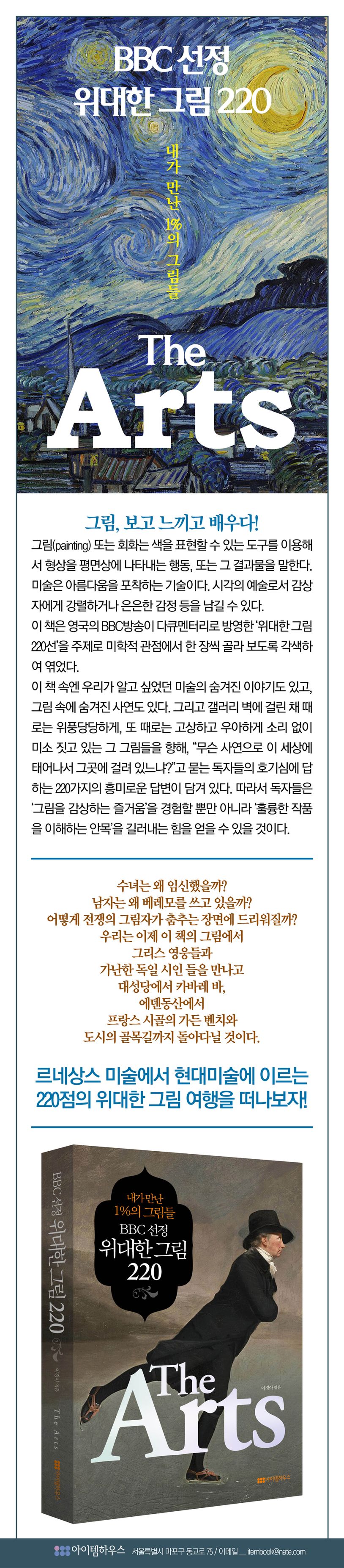 이 책은 영국의 BBC방송이 다큐멘터리로 방영한 ‘위대한 그림 220선’을 주제로 미학적 관점에서 한 장씩 골라 보도록 각색하여 엮었다. 이 책 속엔 우리가 알고 싶었던 미술의 숨겨진 이야기도 있고, 그림 속에 숨겨진 사연도 있다. 그리고 갤러리 벽에 걸린 채 때로는 위풍당당하게, 또 때로는 고상하고 우아하게 소리 없이 미소 짓고 있는 그 그림들을 향해, 이 책은 독자들의 호기심에 답하는 220가지의 흥미로운 답변이 담겨 있다. 따라서 독자들은 ‘그림을 감상하는 즐거움’을 경험할 뿐만 아니라 ‘훌륭한 작품을 이해하는 안목’을 길러내는 힘을 얻을 수 있을 것이다. 꺼려했던 이들에게도 다정하고 친절한 감성의 동반자가 되어줄 책이다.