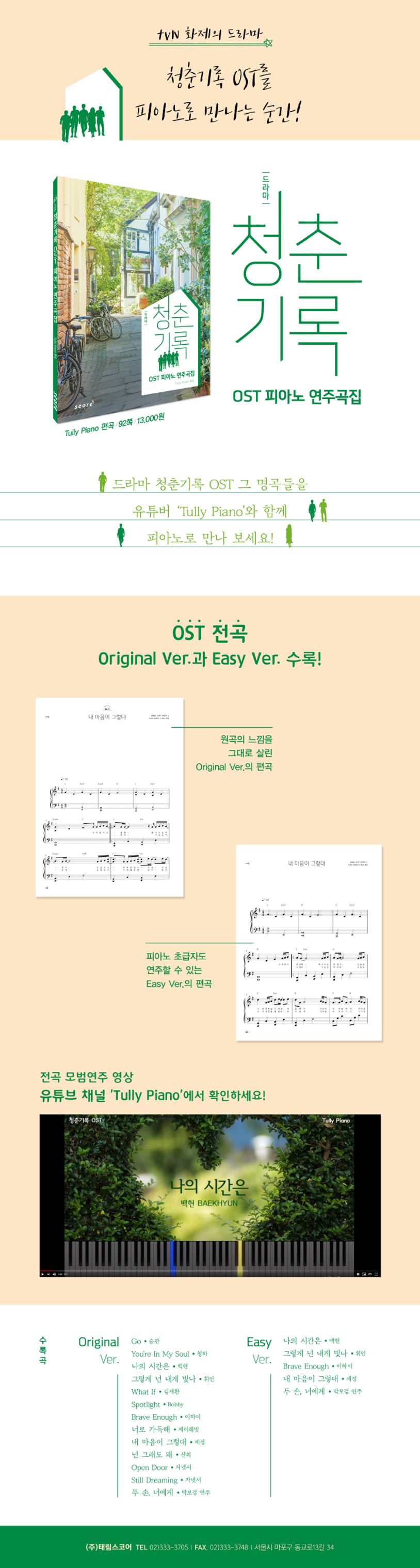 〈드라마 청춘기록 피아노연주곡집〉은 ‘청춘기록’ OST 전곡을 Easy Ver.과 Original Ver.으로 구성한 피아노 연주곡집입니다. 유튜브의 피아노 아티스트 ‘Tully Piano’의 감성적인 편곡으로 드라마의 감동을 피아노로 연주할 수 있습니다. 누구나 쉽게 연주할 수 있는 수준의 Easy Ver.과 원곡의 느낌을 그대로 살리며 연주할 수 있는 Original Ver.으로 그 감동을 구현하였습니다. 또한, QR코드로 모범연주를 감상할 수 있어서 효과적인 연습 시간을 만들어 주는 피아노 연주곡집입니다.
