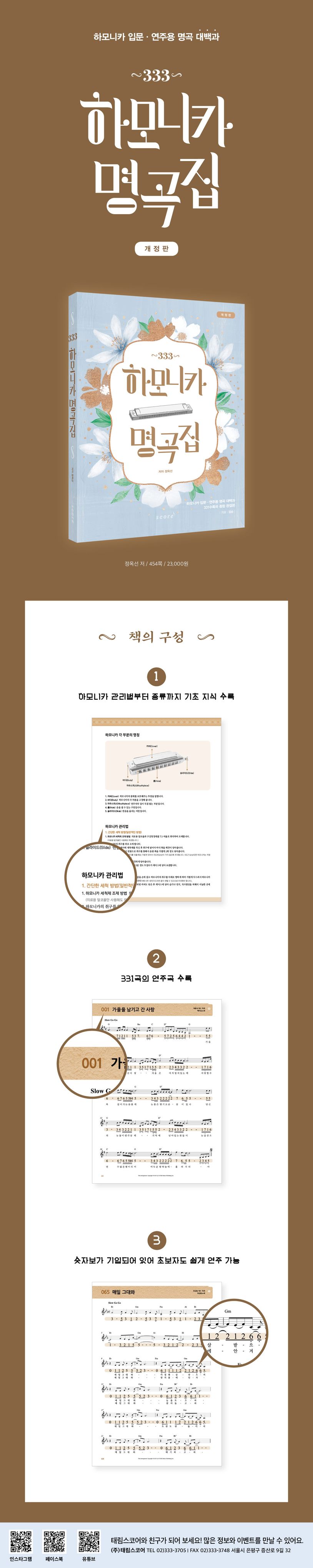 하모니카는 연주자의 들숨과 날숨에 의해 소리가 조절되기 때문에 연주자의 감성을 아주 깊게 느낄 수 있어 어떠한 악기보다도 사람의 마음을 깊이 울리는 힘이 있습니다. 이러한 하모니카 연주를 위해 원하는 곡이 한군데에 모여있지 않아 종이를 펄럭대며 악보를 들고 다니거나 책을 여러 권 챙겨야하는 수고를 가지고 있었다면 『333 하모니카 명곡집』한권으로 모든 문제를 말끔히 해결 할 수 있을 것입니다. 수록곡은 유행하는 가요가 아닌 꾸준히 사랑받는 가요와 팝들로 모아 연령에 상관없이 부르기 좋은 노래로 선곡되어있습니다.