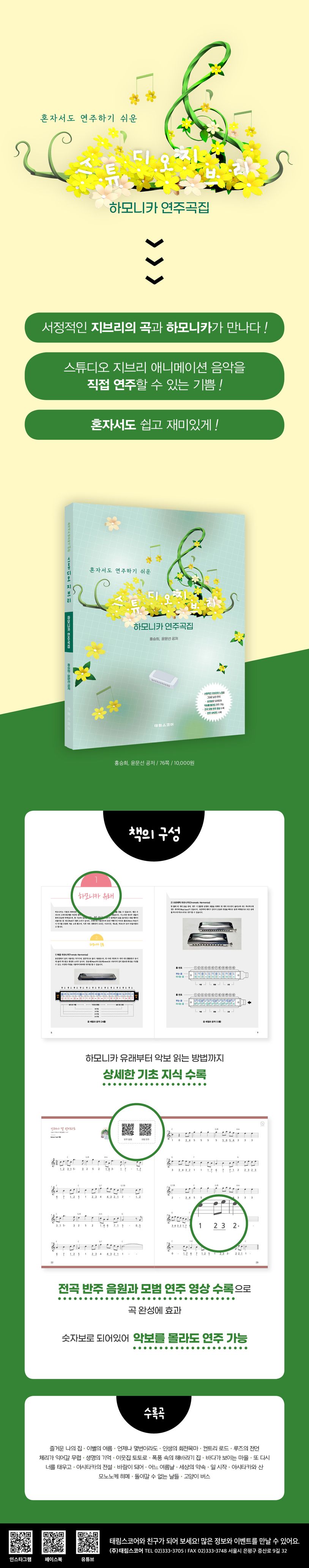 이 책은 하모니카 음역대에 맞는 연주 가능한 지브리 베스트 곡들을 모아서 하모니카를 처음 배우는 사람도 재미있게 연주할 수 있도록 최대한 쉽게 원곡의 느낌을 살리면서 편곡하였습니다. 가장 사랑 받는 지브리 OST 인기곡을 엄선하여 수록하였습니다. 또한 전곡 반주 음원과 모범 연주 영상을 수록하였고 숫자보로 되어있어 악보를 몰라도 연주가 가능합니다.